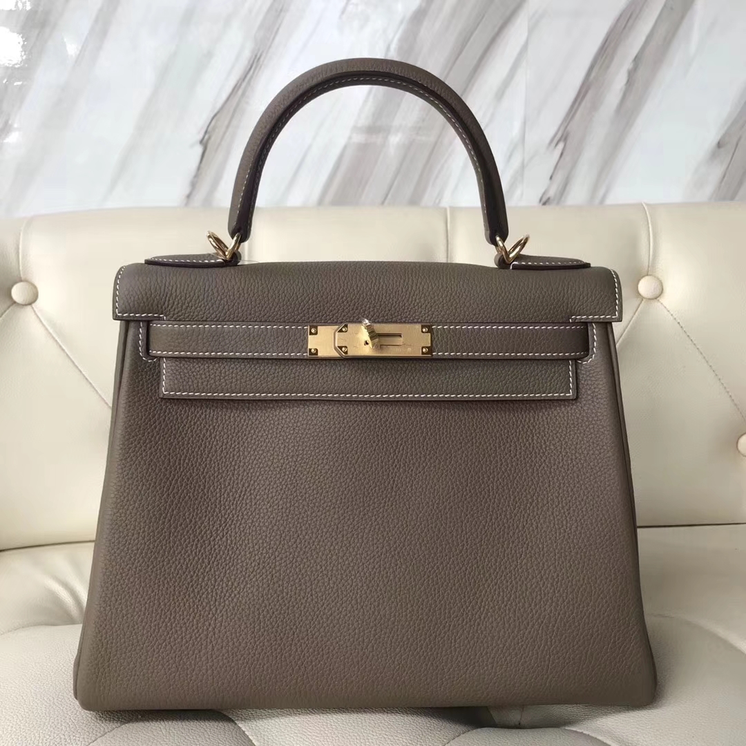 Brand: Hermes; Style: Retourne Kelly Bag; Material: Togo Calf Leather; Color: CK18 Etoupe Grey; Size:28cm; Hardware: Gold/Silver; Accessories: Padlock and keys, dust bag.Functions: tote bag,shoulder bag.