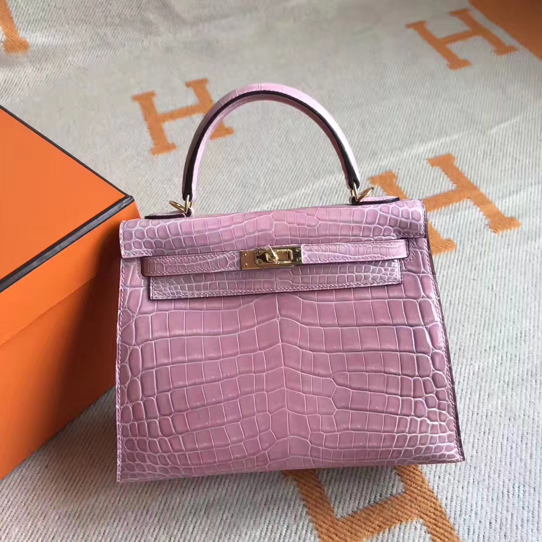 Brand: Hermes; Style: Sellier Kelly Bag; Material: Crocodile Shiny Leather; Color: 5Z Rose Indienne ;Size:25cm; Hardware:Gold; Accessories: Padlock and Keys, Dust Bag.Functions: Tote Bag,Shoulder Bag.