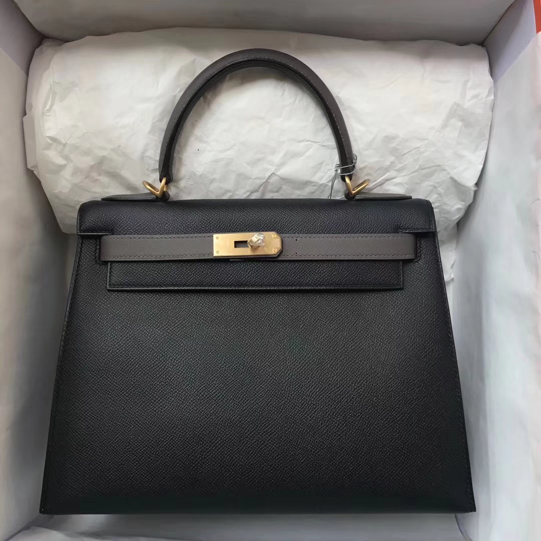 Brand: Hermes; Style: Sellier Kelly Bag; Material: Epsom Calf Leather; Color:CK89 Black/8F Etain Grey;Size:28cm; Hardware:Gold; Accessories: Padlock and Keys, Dust Bag.Functions: Tote Bag,Shoulder Bag.