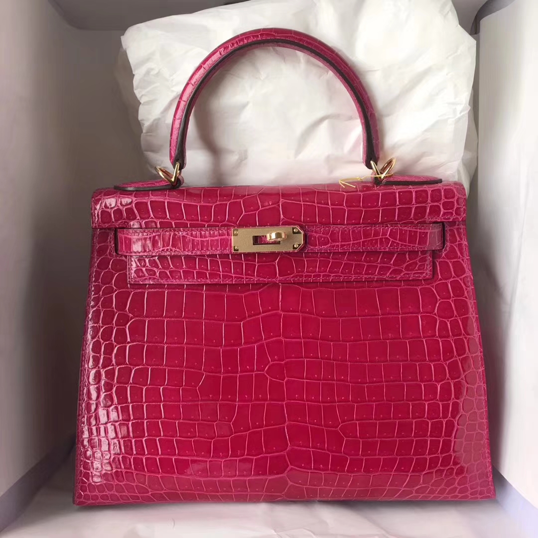 Hermes J5 Rose Scheherazade Shiny Crocodile Leather Kelly Bag 28CM