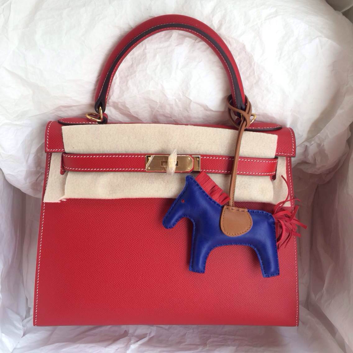 Brand: Hermes; Style: Kelly Bag Sellier; Material: France Epsom leather;Color:Q5 Candy Red/inner Blue Jean; Hardware: gold/silver; Accessories: Padlock and keys, dust bag.