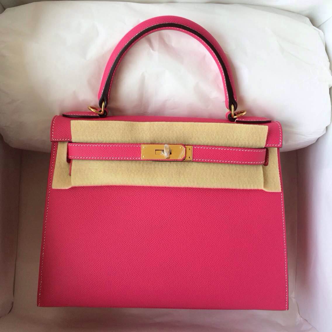 Brand: Hermes; Style: Kelly Bag Sellier; Material: France Epsom leather;Color:E5 Rose Tyrien/Ruby inner; Hardware: gold/silver; Accessories: Padlock and keys, dust bag.