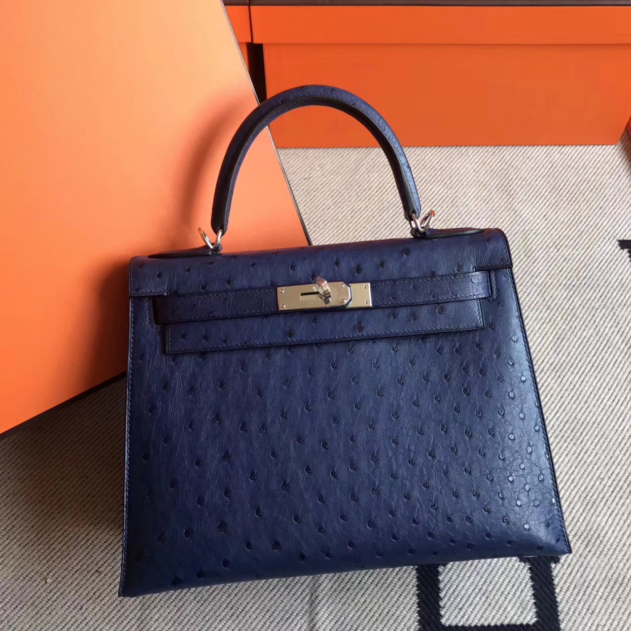 Brand: Hermes; Style: Sellier Kelly Bag; Material: Ostrich Leather; Color:7K Dark Blue;Size:28cm; Hardware:Silver; Accessories: Padlock and keys, dust bag.Functions: tote bag,shoulder bag.