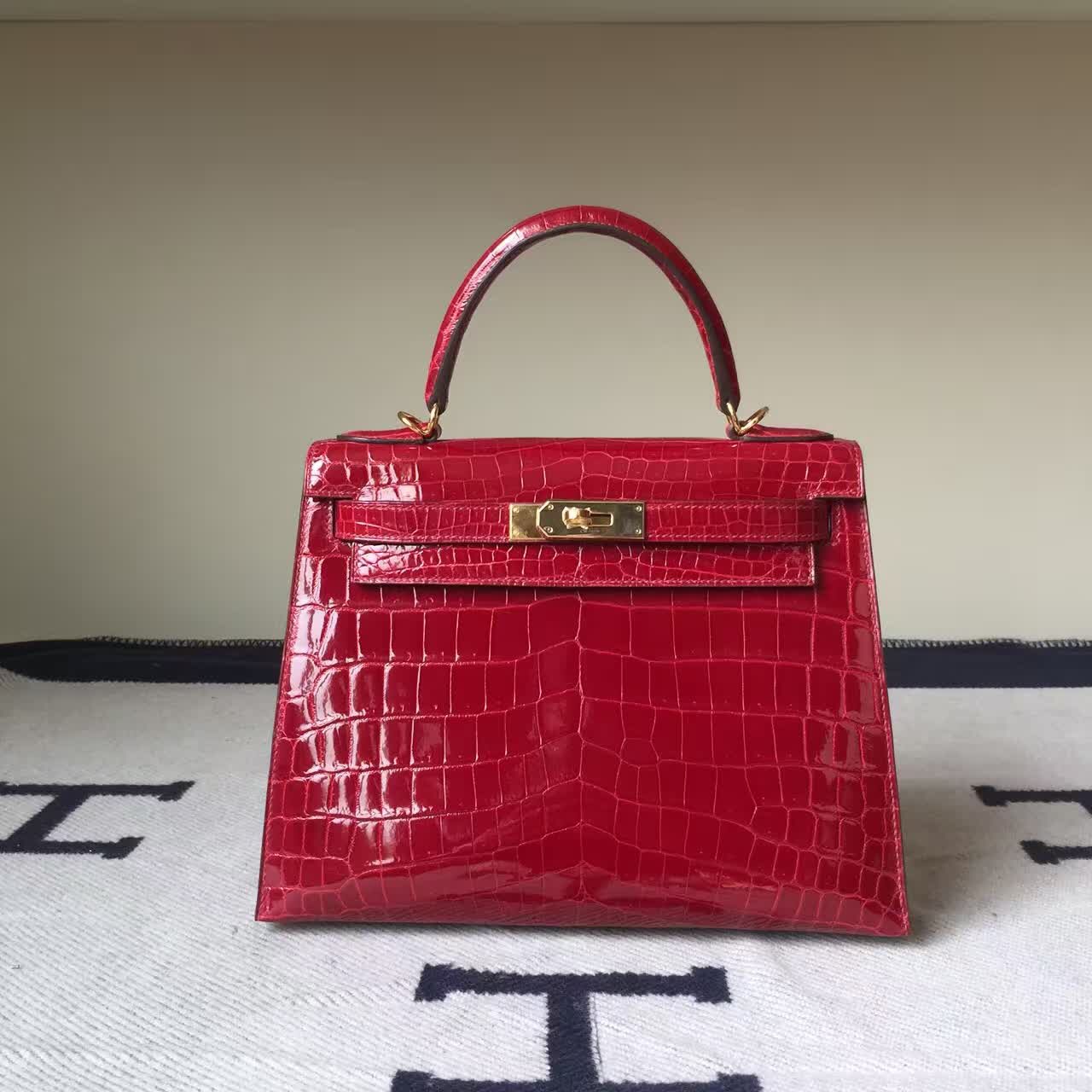 Hand Stitching Hermes CK55 Rouge Hermes Crocodile Shiny Leather Kelly Bag 28CM
