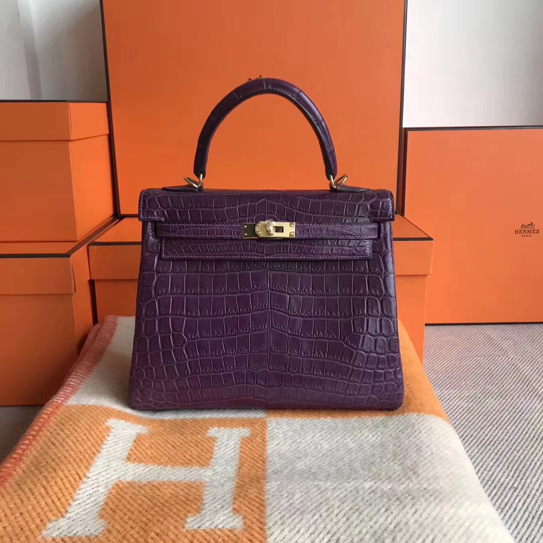Brand: Hermes; Style: Retourne Kelly Bag; Material:Matt Crocodile Leather; Color:P9 Anemone Purple; Size:25cm; Hardware: Gold; Accessories: Padlock and Keys, Dust Bag.Functions: Tote Bag,Shoulder Bag.