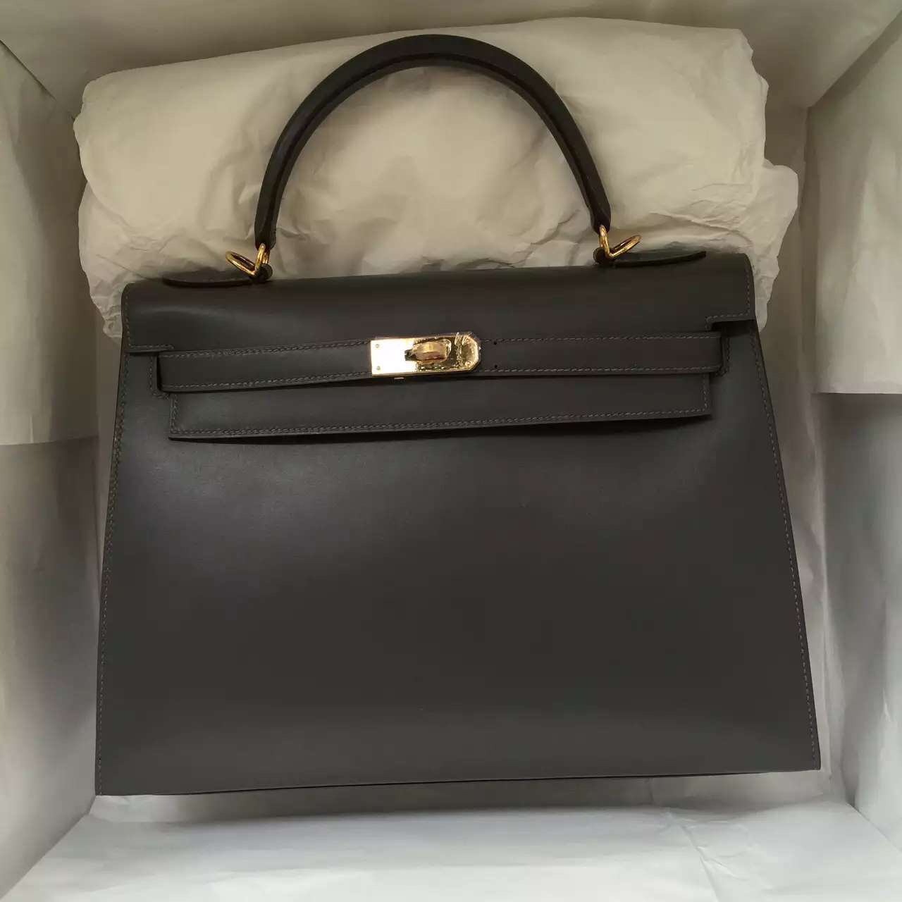 Hermes 8F Etain Grey Box Leather Sellier Kelly Bag 32CM Womens Tote Bag