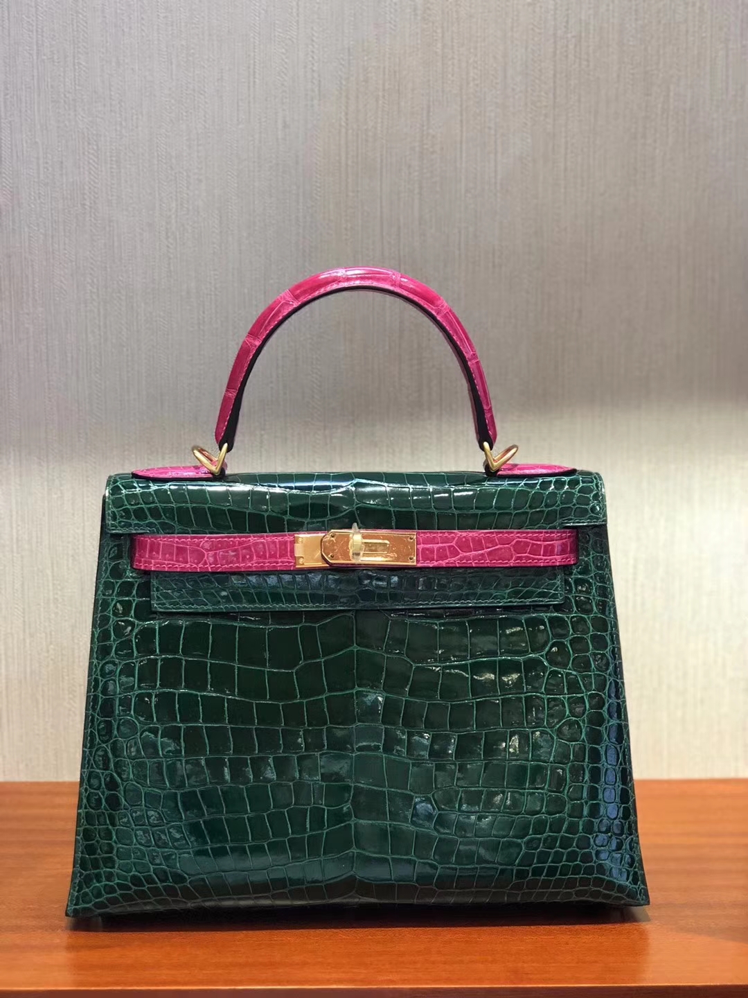 Brand: Hermes; Style: Sellier Kelly Bag; Material: Shiny Porosus Crocodile Leather; Color:CK67 Vert Fonce/J5 Rose Scheherazade;Size:28cm; Hardware:Gold; Accessories: Padlock and Keys, Dust Bag.Functions: Tote Bag,Shoulder Bag.