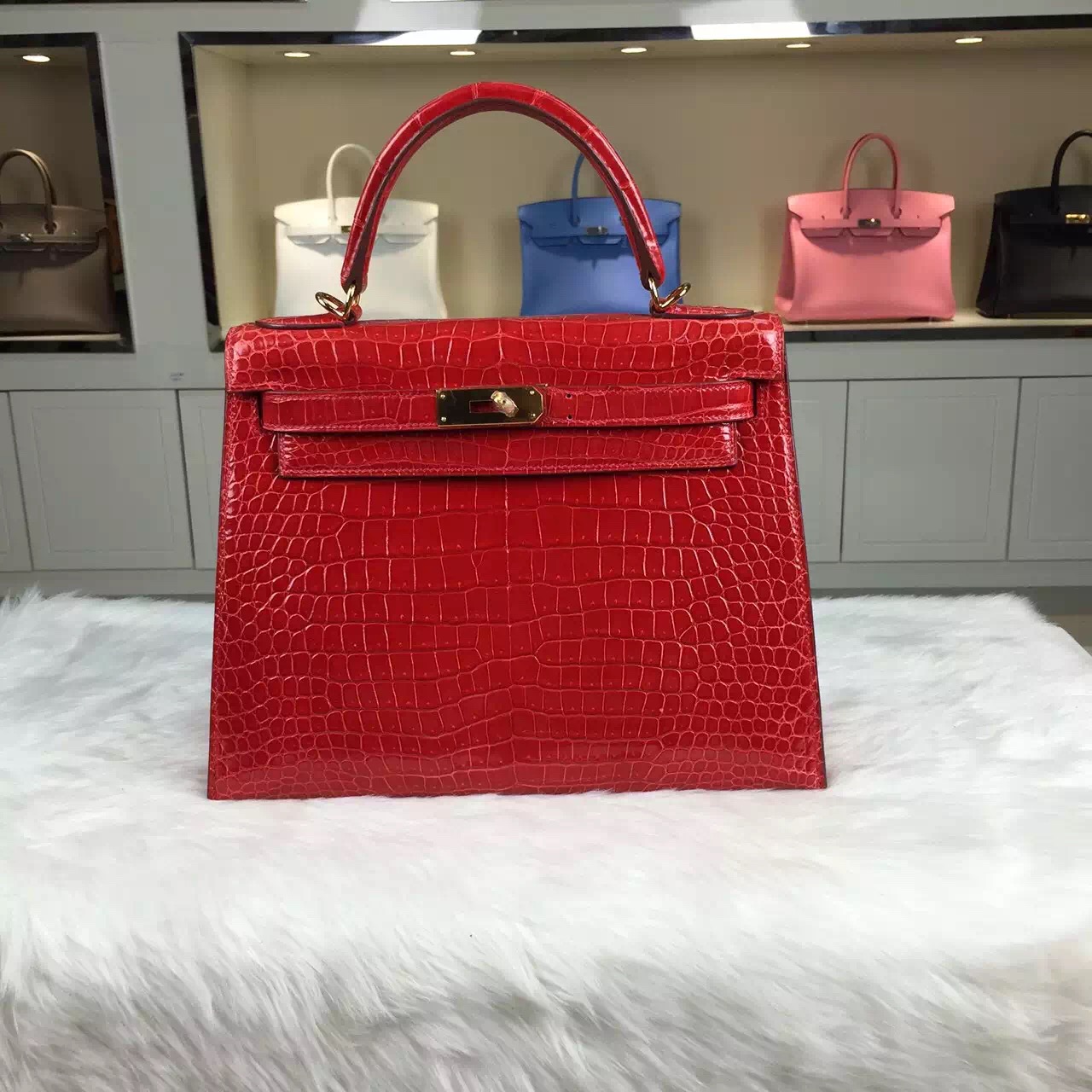 Brand: Hermes; Style: Kelly Bag 28cm; Material: Crocodile Leather(original leather);Color:CK95 Ferrari Red; Hardware: gold; Accessories: Padlock and keys, dust bag.Function:tote bag.