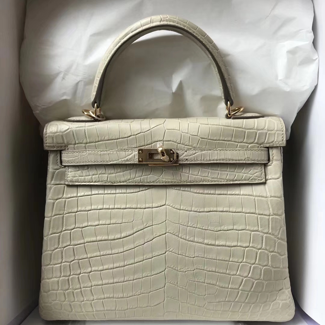 Brand: Hermes; Style: Retourne Kelly Bag; Material:Crocodile Matt Leather; Color: 8L Beton White; Size:25cm; Hardware: Gold; Accessories: Padlock and Keys, Dust Bag.Functions: Tote Bag,Shoulder Bag.