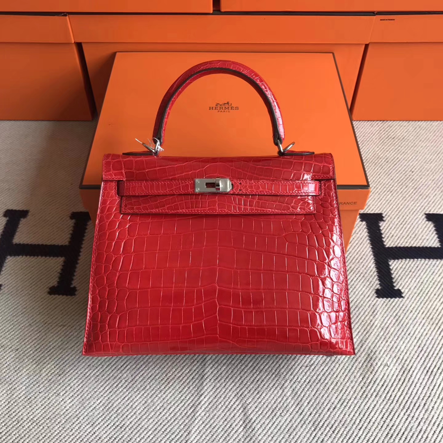 Brand: Hermes; Style: Sellier Kelly Bag; Material: Crocodile Shiny Leather; Color:CK95 Braise;Size:25cm; Hardware: Silver; Accessories: Padlock and keys, dust bag.Functions: tote bag,shoulder bag.