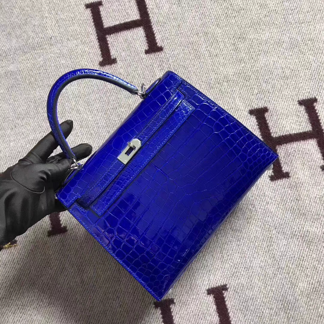 Brand: Hermes; Style: Sellier Kelly Bag; Material: Shiny Crocodile Leather; Color: Blue Electric;Size:25cm; Hardware: Silver; Accessories: Padlock and Keys, Dust Bag.Functions: Tote Bag,Shoulder Bag.