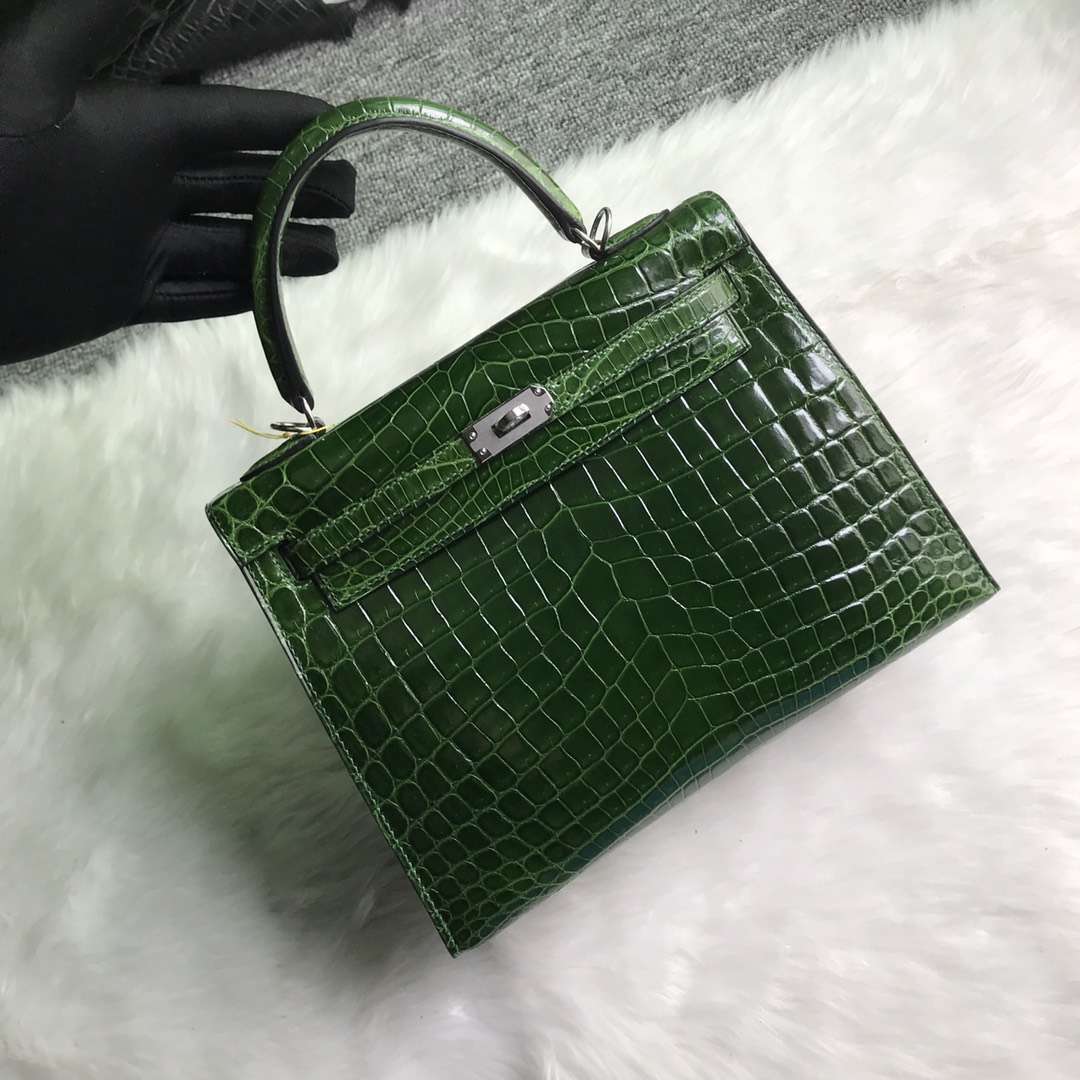 Hermes CK67 Vert Fonce Shiny Crocodile Kelly Bag 25cm Silver Hardware