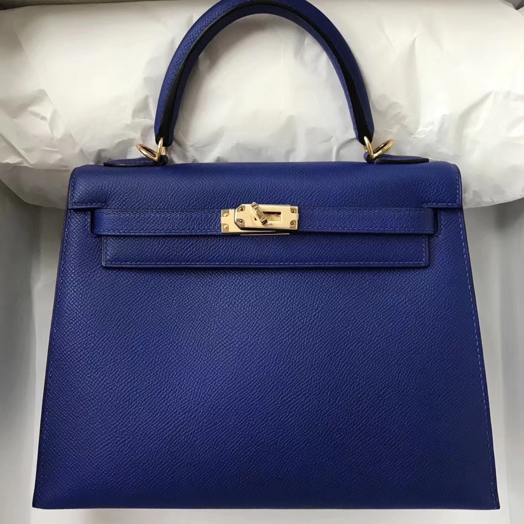 Brand: Hermes; Style: Sellier Kelly Bag; Material: Epsom Calf Leather; Color:7T Blue Electric;Size:25cm; Hardware:Gold; Accessories: Padlock and Keys, Dust Bag.Functions: Tote Bag,Shoulder Bag