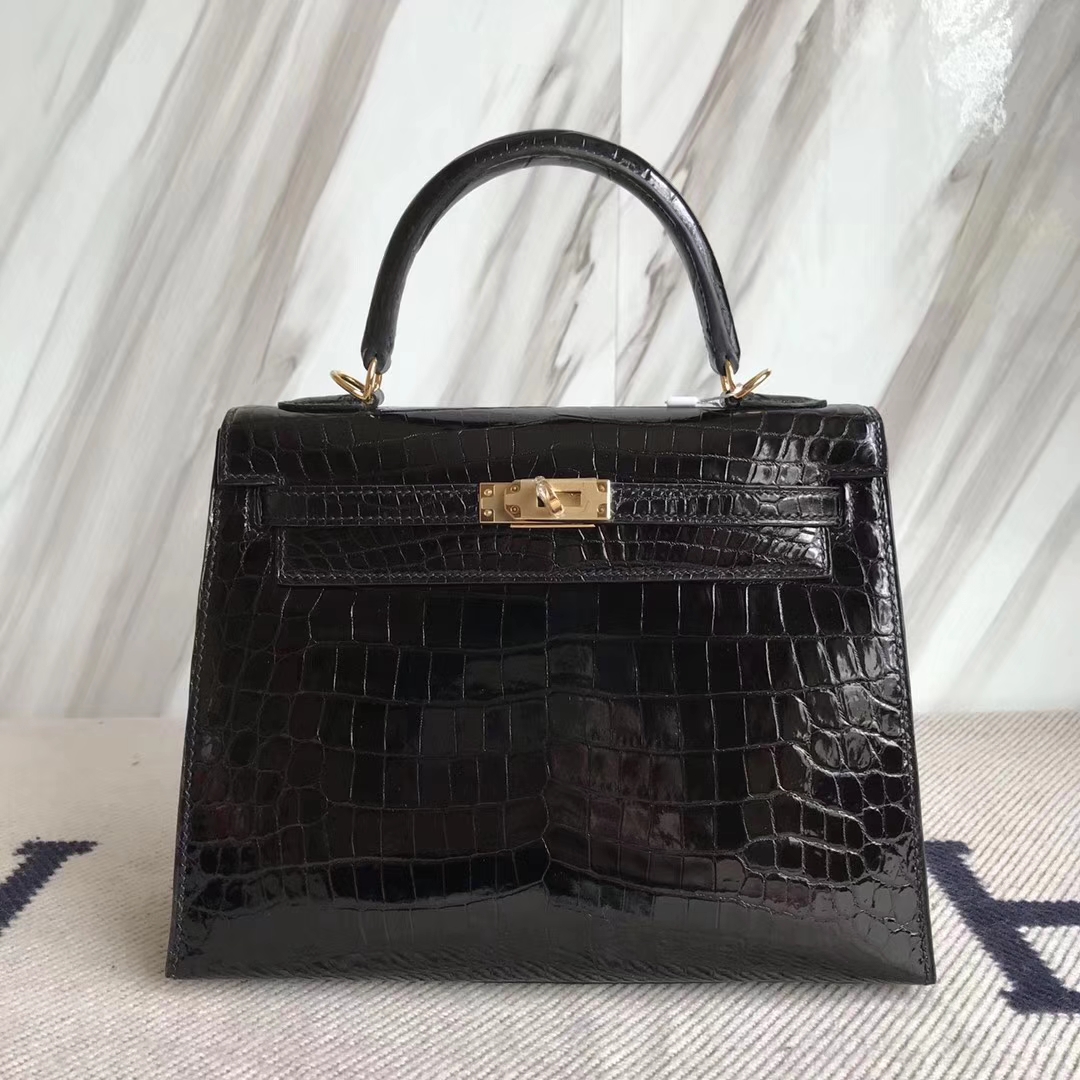 Brand: Hermes; Style: Sellier Kelly Bag; Material: Shiny Crocodile Leather; Color:CK89 Black; Size:25cm; Hardware:Gold; Accessories: Padlock and Keys, Dust Bag.Functions: Tote Bag,Shoulder Bag