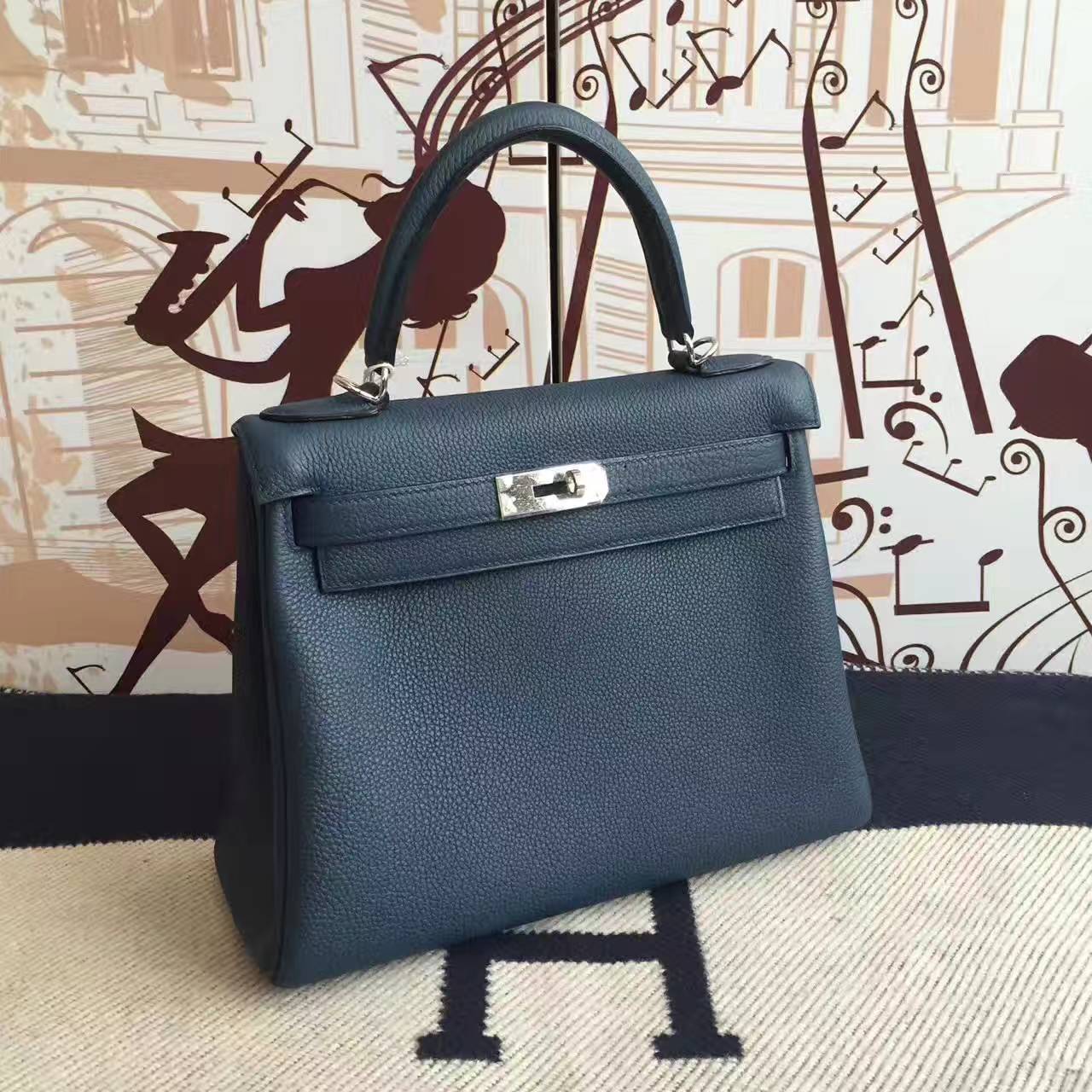 On Hermes 7K Dark Blue Togo Calfskin Leather Kelly Bag 28CM