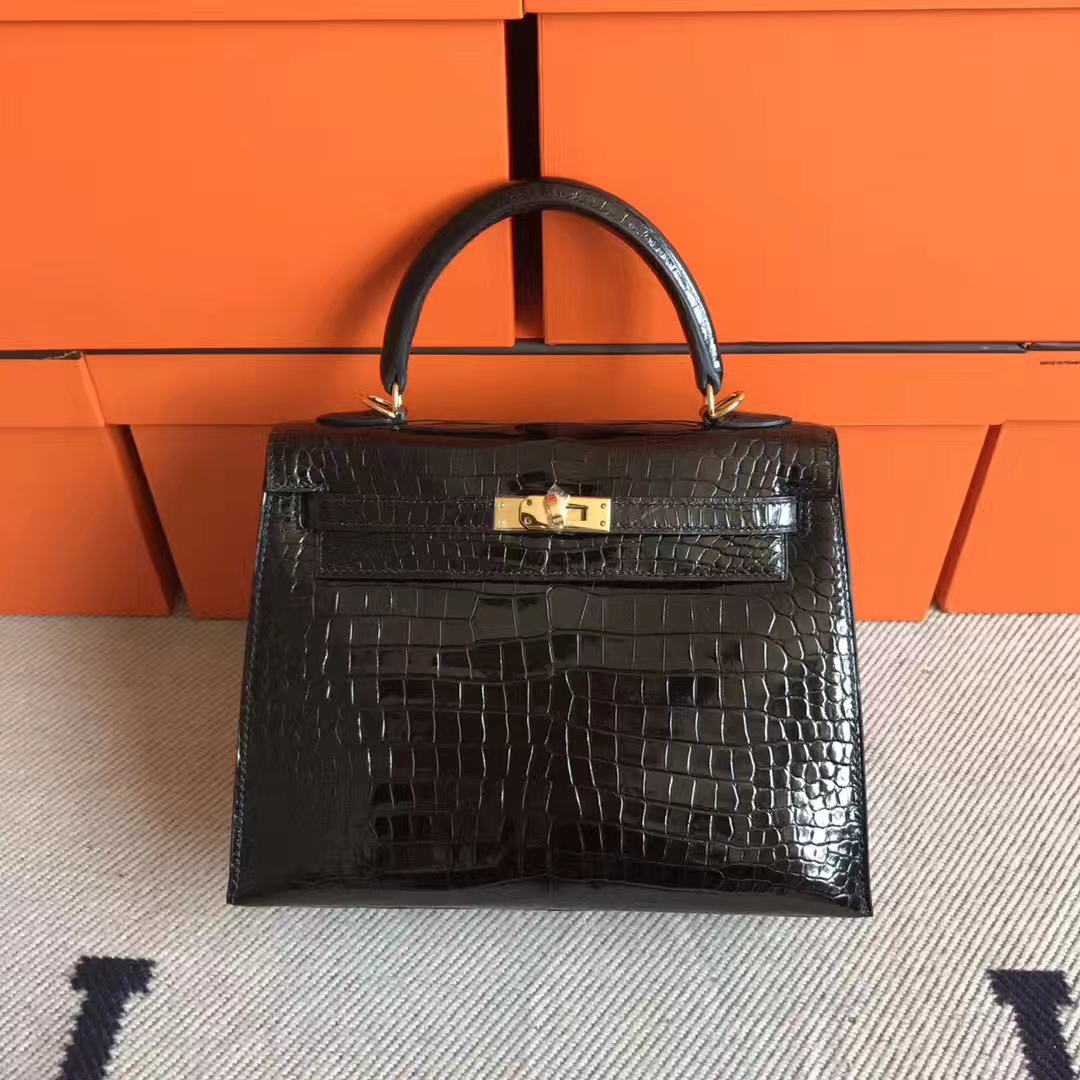 Brand: Hermes; Style: Sellier Kelly Bag; Material: Porosus Crocodile Shiny Leather; Color:CK89 Black ;Size:25cm; Hardware: Gold; Accessories: Padlock and keys, dust bag.Functions: tote bag,shoulder bag.