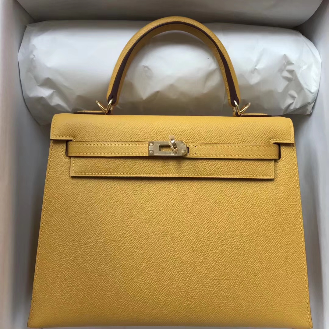 Brand: Hermes; Style: Sellier Kelly Bag; Material: Epsom Calf Leather; Color:9D Ambre Yellow;Size:25cm; Hardware:Gold; Accessories: Padlock and Keys, Dust Bag.Functions: Tote Bag,Shoulder Bag.