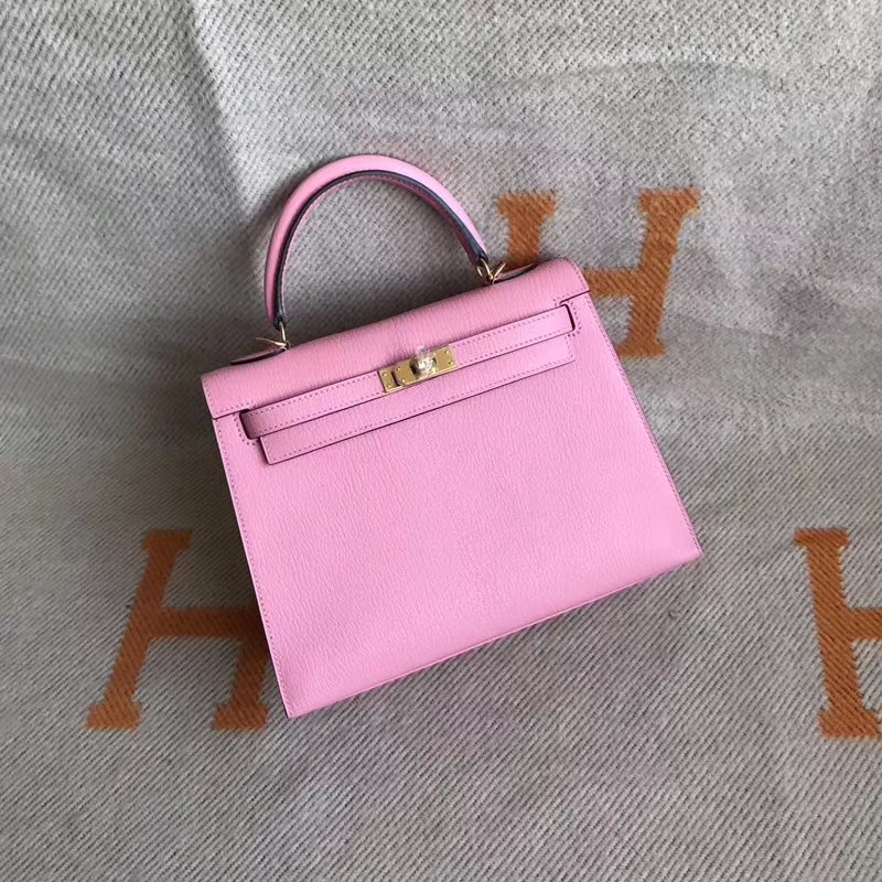 Brand: Hermes; Style: Sellier Kelly Bag; Material: Chevre Leather; Color:1Q Rose Confetti;Size:25cm; Hardware: Gold; Accessories: Padlock and Keys, Dust Bag.Functions: Tote Bag,Shoulder Bag.