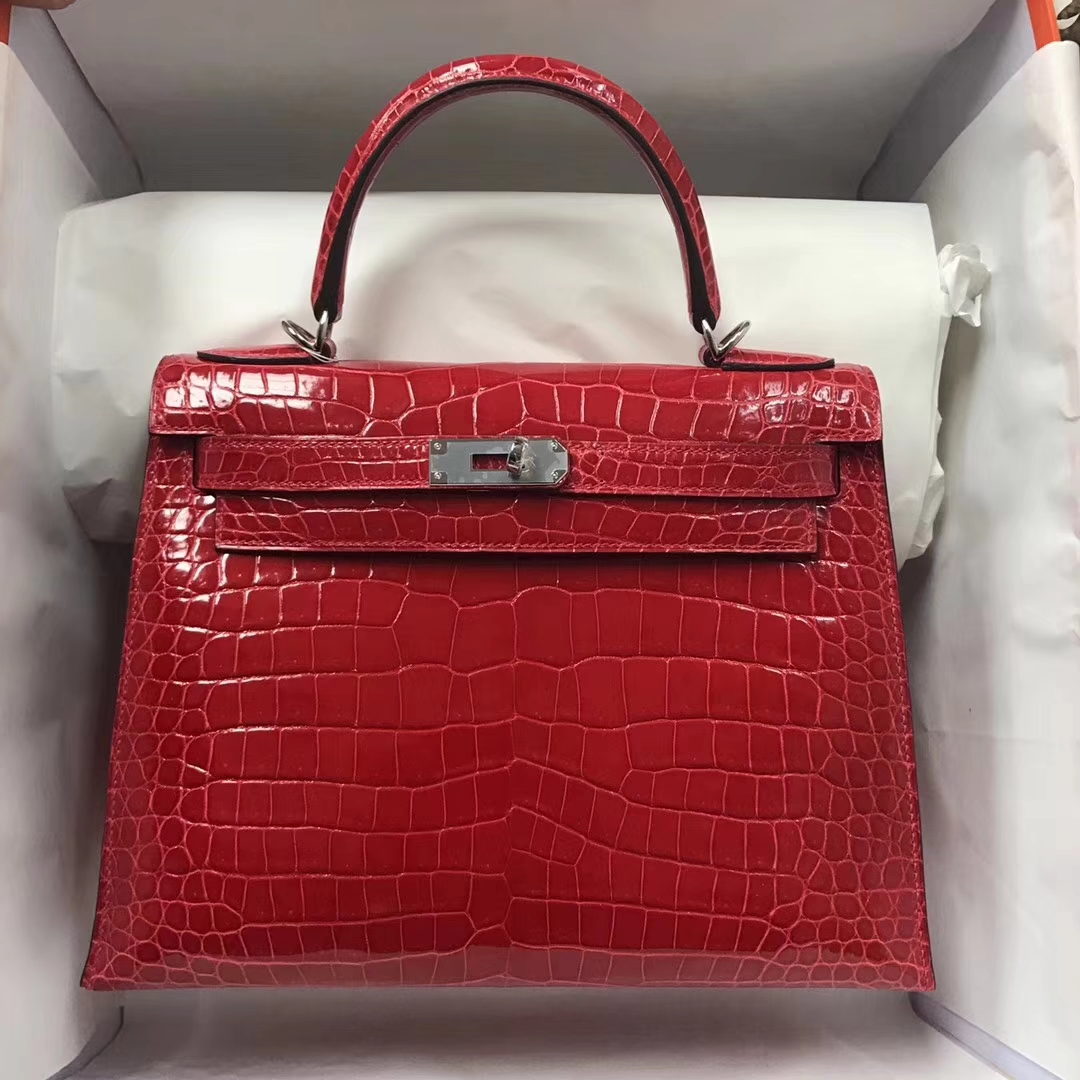 Brand: Hermes; Style: Sellier Kelly Bag; Material: Porosus Shiny Crocodile Leather; Color:CK95 Braise;Size:28cm; Hardware:Silver; Accessories: Padlock and Keys, Dust Bag.Functions: Tote Bag,Shoulder Bag.