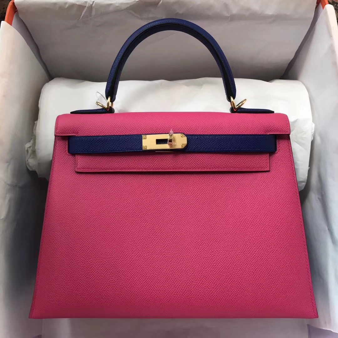 Brand: Hermes; Style: Sellier Kelly Bag; Material: Epsom Calf Leather; Color:E5 Rose Tyrien/7T Blue Eletric;Size:28cm; Hardware:Gold; Accessories: Padlock and Keys, Dust Bag.Functions: Tote Bag,Shoulder Bag.