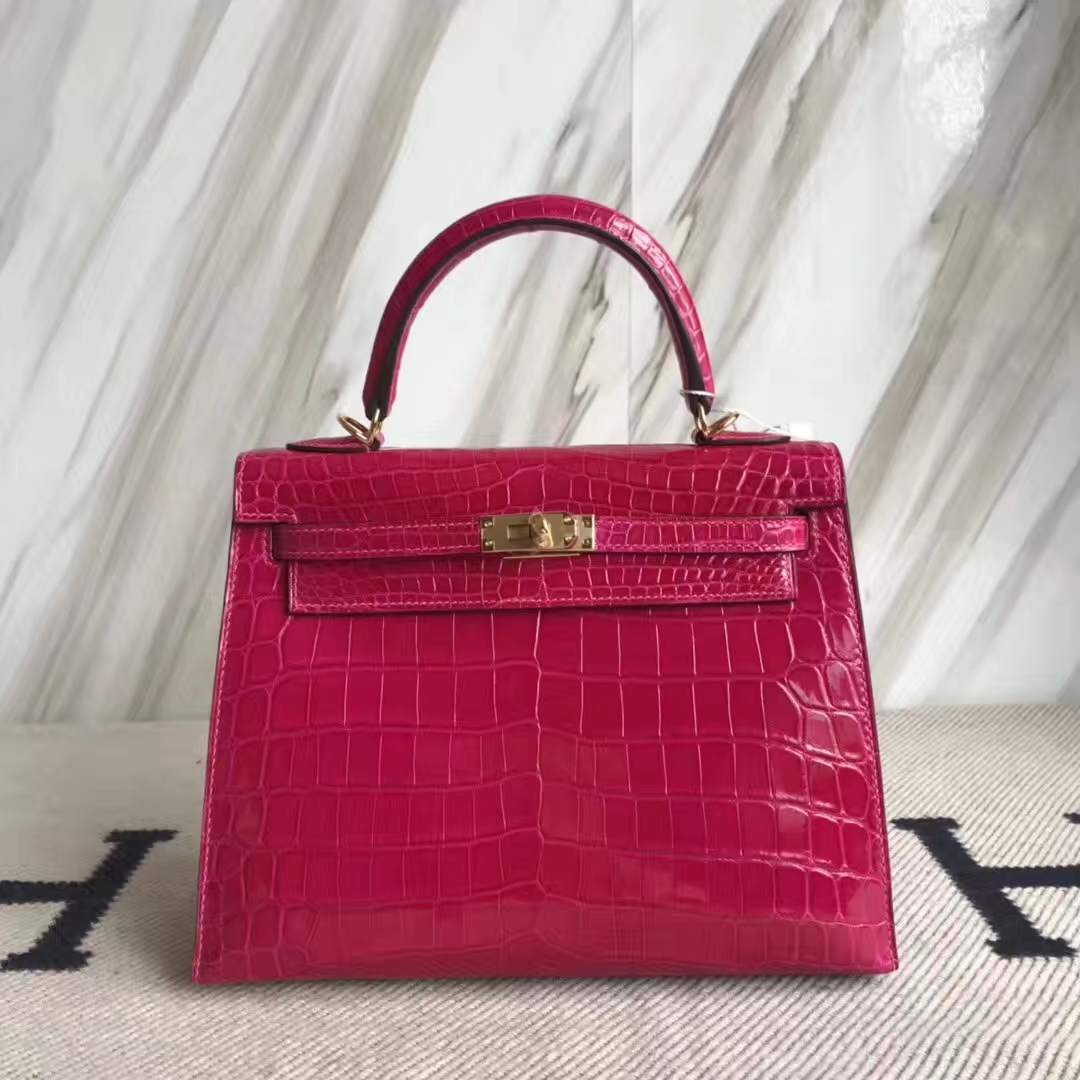 Brand: Hermes; Style: Sellier Kelly Bag; Material: Shiny Crocodile Leather; Color:J5 Rose Scheherazade; Size:25cm; Hardware:Gold; Accessories: Padlock and Keys, Dust Bag.Functions: Tote Bag,Shoulder Bag