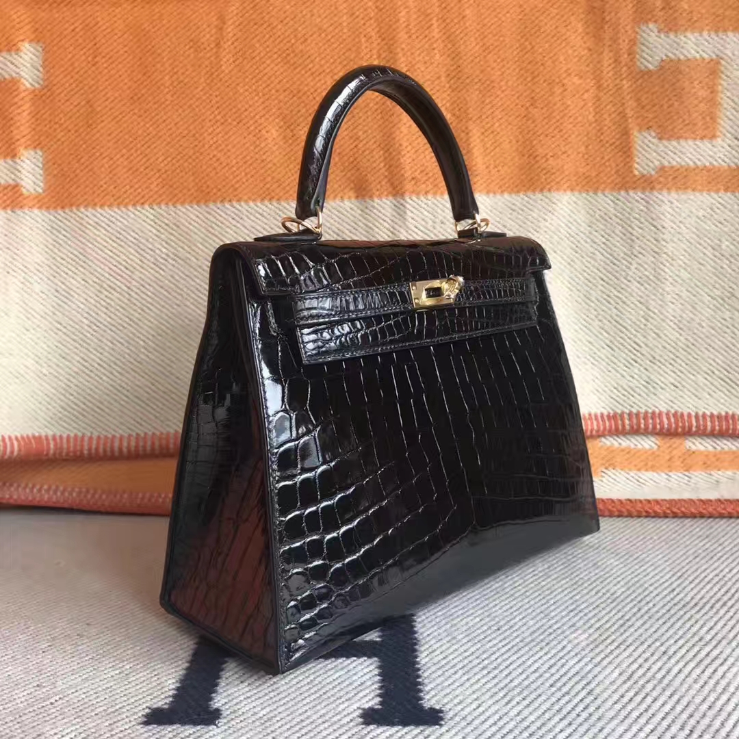 Hermes CK89 Black Shiny Crocodile Leather Kelly 25CM Bag Gold Hardware