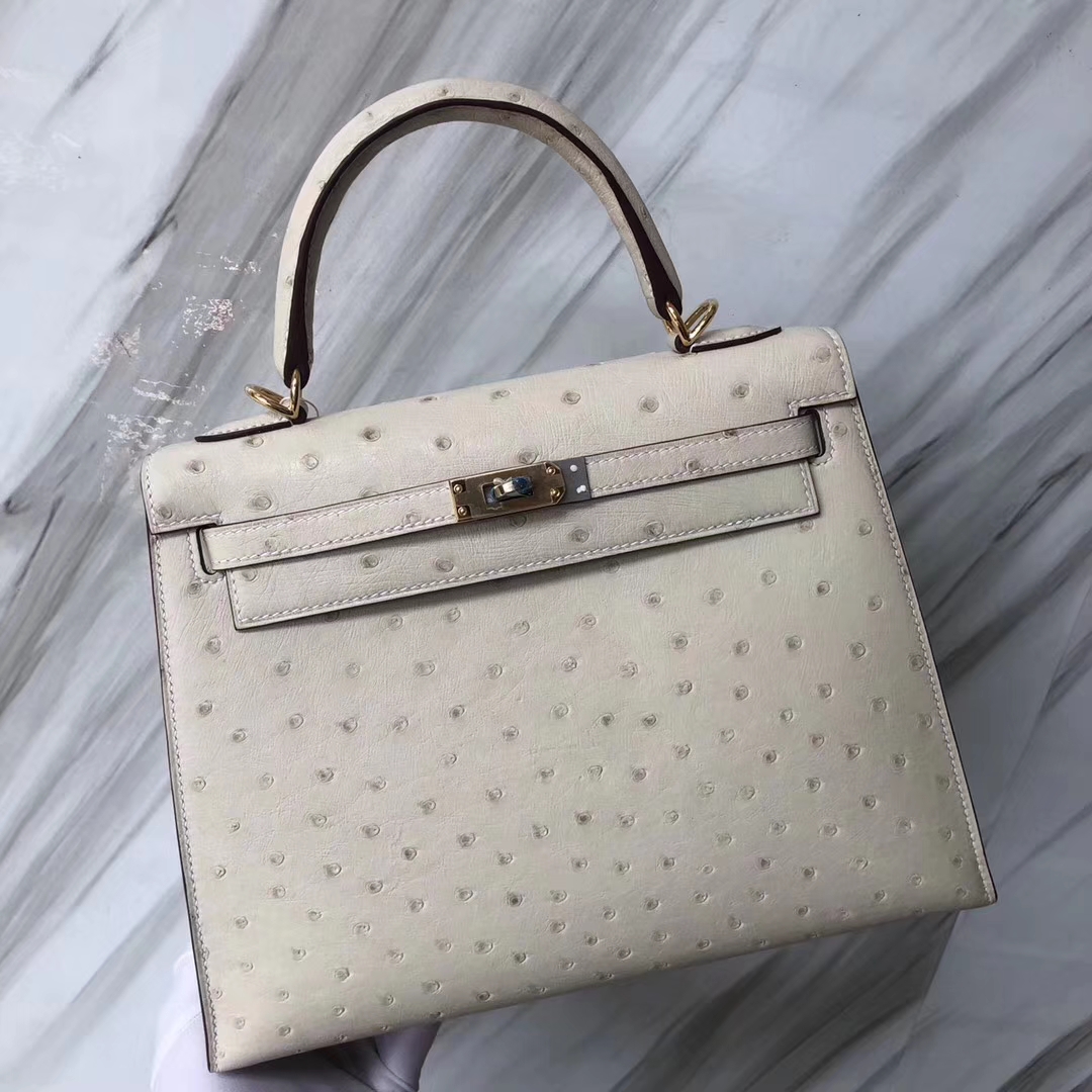 Brand: Hermes; Style: Sellier Kelly Bag; Material:Ostrich Leather; Color:3C Wool White;Size:25cm; Hardware:Gold; Accessories: Padlock and Keys, Dust Bag.Functions: Tote Bag,Shoulder Bag