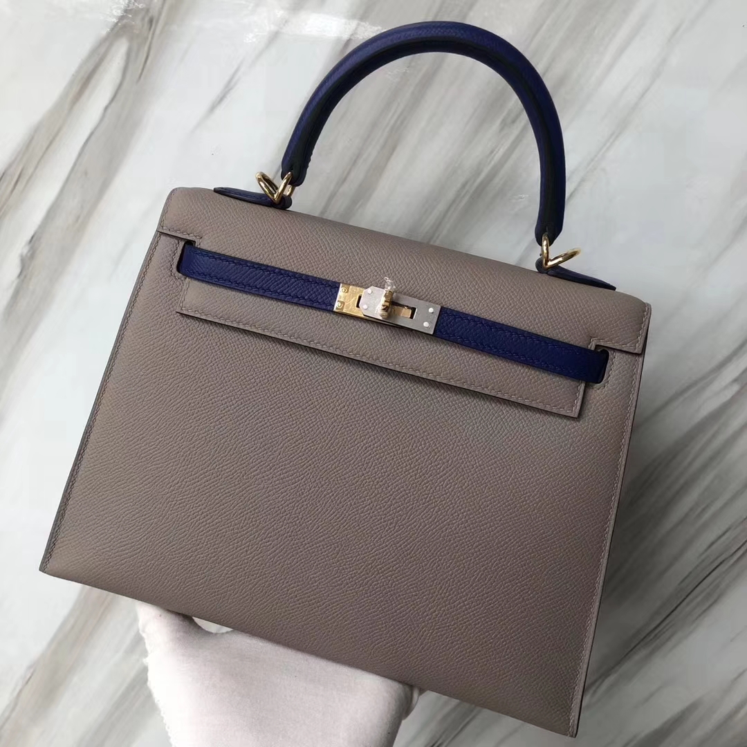Brand: Hermes; Style: Sellier Kelly Bag ; Material:Epsom Calf Leather; Color:M8 Gris Ashpite/7T Blue Electric;Size:25cm; Hardware:Gold; Accessories: Padlock and Keys, Dust Bag.Functions: Tote Bag,Shoulder Bag