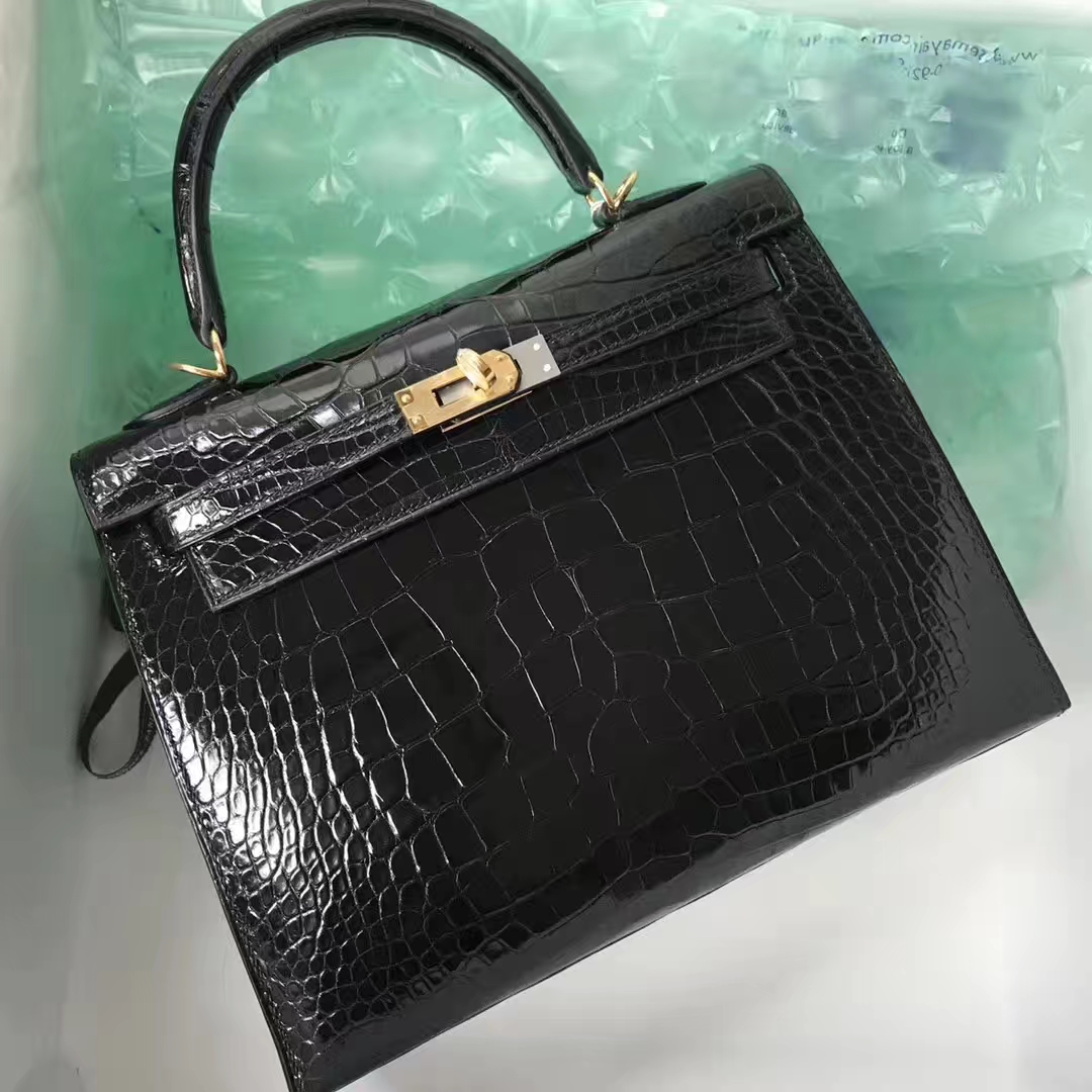 Brand: Hermes; Style: Sellier Kelly Bag; Material:Shiny Crocodile Leather; Color:CK89 Noir;Size:25cm; Hardware:Gold; Accessories: Padlock and Keys, Dust Bag.Functions: Tote Bag,Shoulder Bag