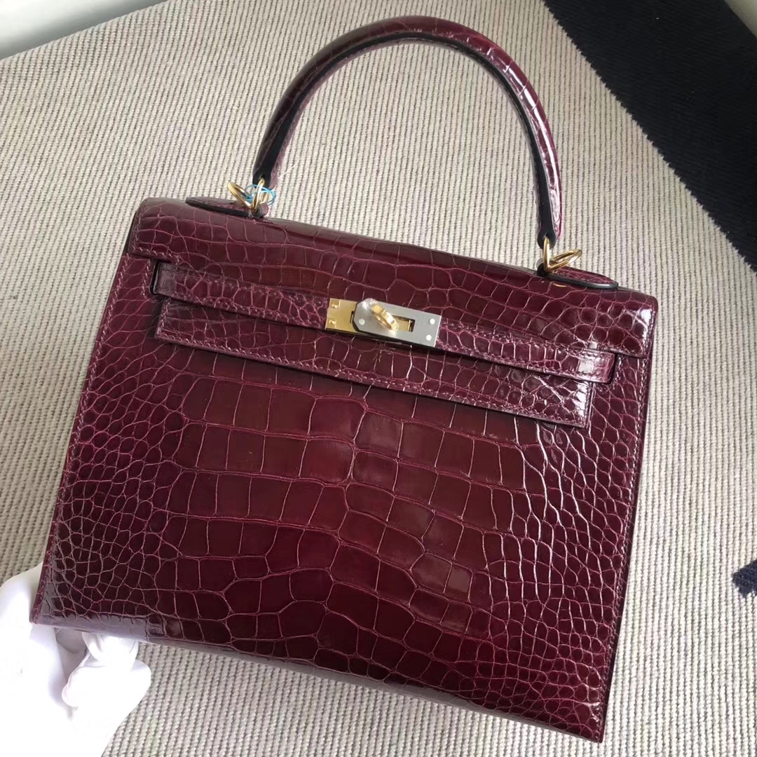 Stock Noble Hermes Shiny Crocodile Kelly Bag25CM in CK57 Bordeaux Gold Hardware Stock Noble Hermes Shiny Crocodile Kelly Bag25CM in CK57 Bordeaux Gold Hardware