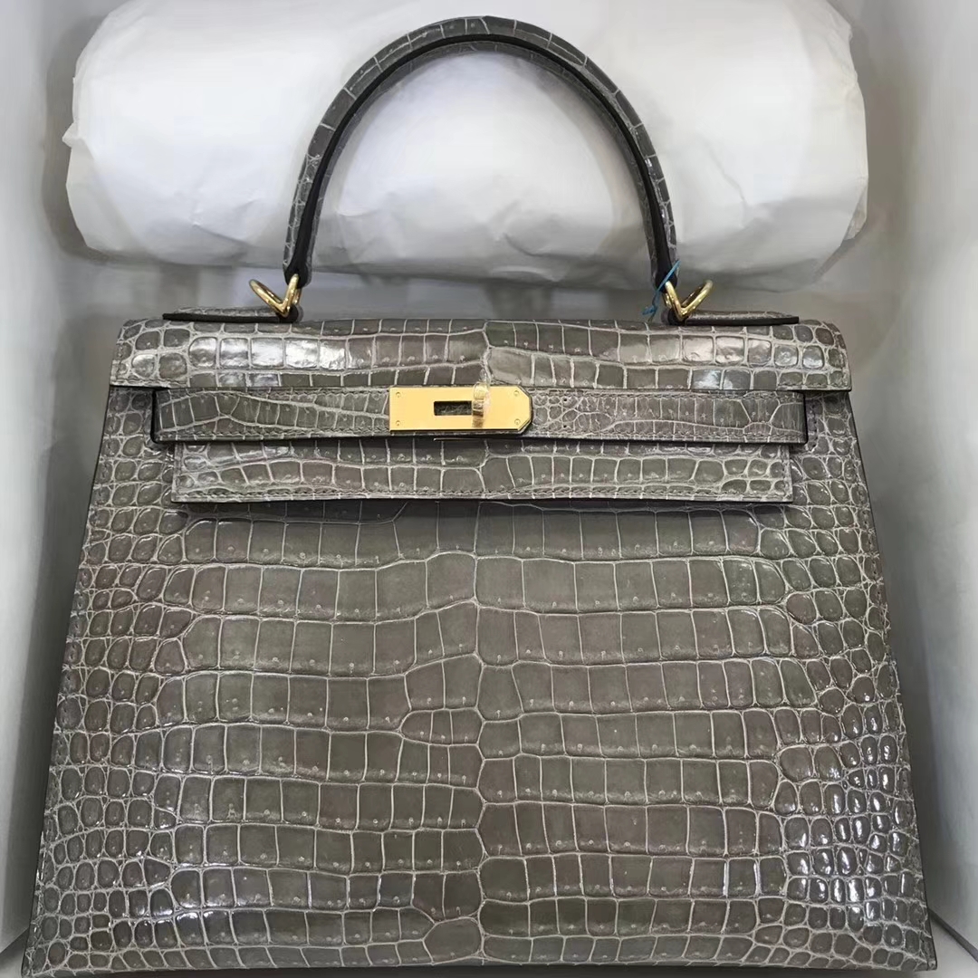 Brand: Hermes; Style: Sellier Kelly Bag; Material: Porosus Shiny Crocodile Leather; Color:C81 Gris Tourterelle;Size:28cm; Hardware:Gold; Accessories: Padlock and Keys, Dust Bag.Functions: Tote Bag,Shoulder Bag.