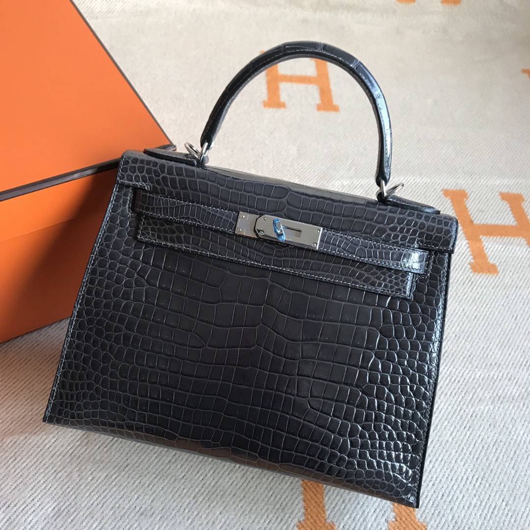 Brand: Hermes; Style: Sellier Kelly Bag; Material: Crocodile Shiny Leather; Color: CK88 Graphite Grey;Size:28cm; Hardware: Silver; Accessories: Padlock and Keys, Dust Bag.Functions: Tote Bag,Shoulder Bag.