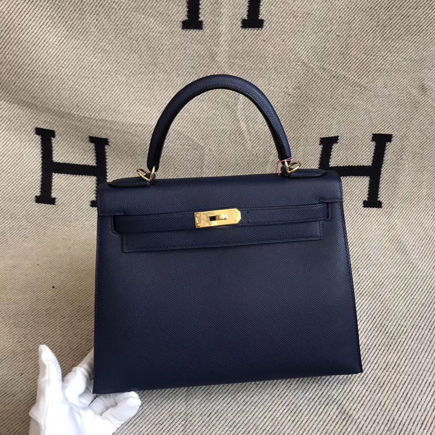 Brand: Hermes; Style: Sellier Kelly Bag; Material: Epsom Calfskin Leather; Color:7K Dark Blue;Size:28cm; Hardware: Gold; Accessories: Padlock and Keys, Dust Bag.Functions: Tote Bag,Shoulder Bag.