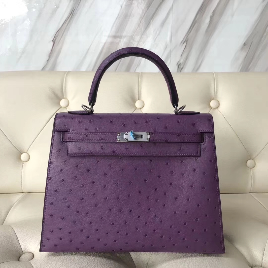 Brand: Hermes; Style: Sellier Kelly Bag; Material:Ostrich Leather; Color:P9 Anemone Purple; Size:25cm; Hardware:Silver; Accessories: Padlock and Keys, Dust Bag.Functions: Tote Bag,Shoulder Bag