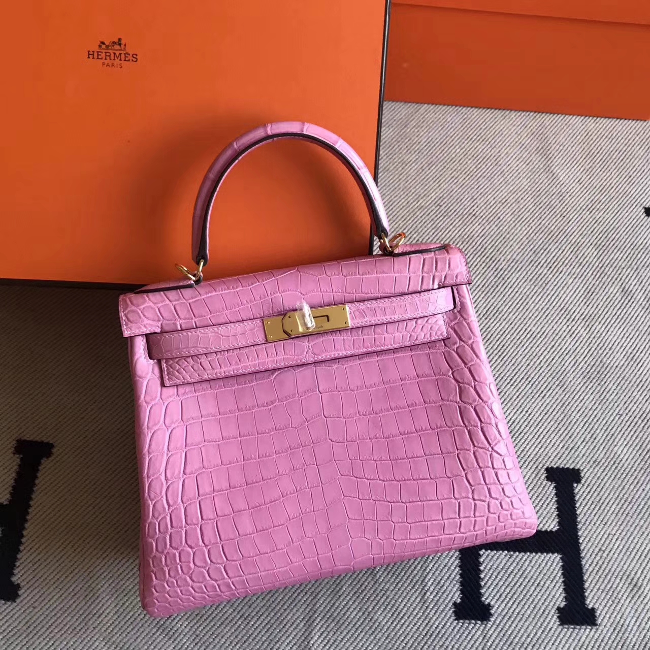 Brand: Hermes; Style: Retourne Kelly Bag ; Material: Crocodile Matt Leather; Color: 5P Rose Sakura; Size:28cm;Hardware: Gold ; Accessories: Padlock and keys, dust bag.Functions: tote bag,shoulder bag.