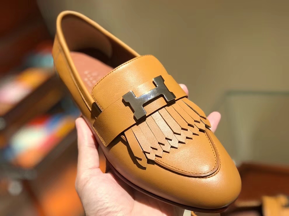 Brand: Hermes; Style: 2018 Autumn H Hardware Fringe Flat Shoes; Material: Chevre Leather;Color: Khaki; Size:35-41; Heel:Flat Heel;Accessories: dust bag, shoe box. Function:Hermes Flat Shoes,Women’s Shoes.