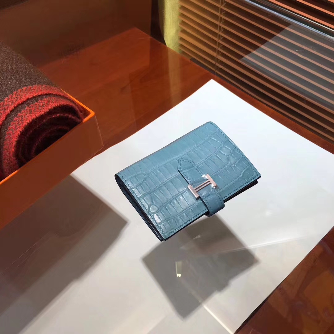 Brand: Hermes; Style: H Buckle Bearn Wallet; Material: Crocodile Matt Leather;Color: Blue; Accessories: Dust Bag, Gift Box; Function:Short Wallet,Purse,Card Bag.
