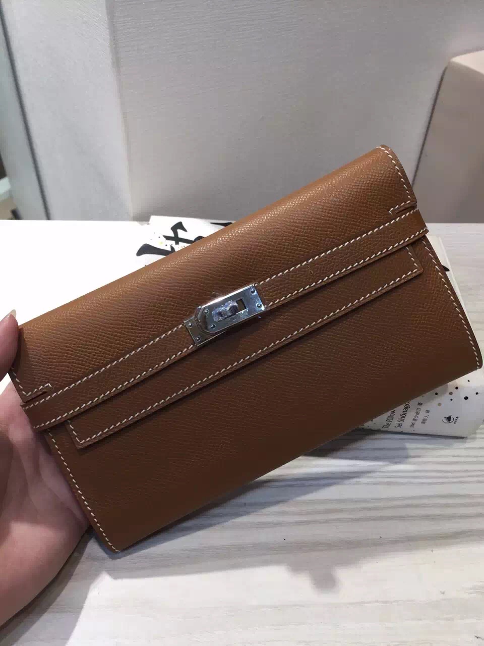 Brand: Hermes; Style: Kelly Wallet; Material: Epsom Leather;Color: Camel; Accessories: Dust Bag, Gift Box; Function:Wallet,Purse,Clutch Bag.